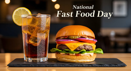 Soda Drink with Condensation Beside Burger for National Fast Food Day
