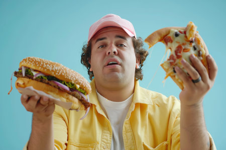 Overwhelmed Man Choosing Between Fast Food Sandwich And Pizza Slice Against Blue Background
