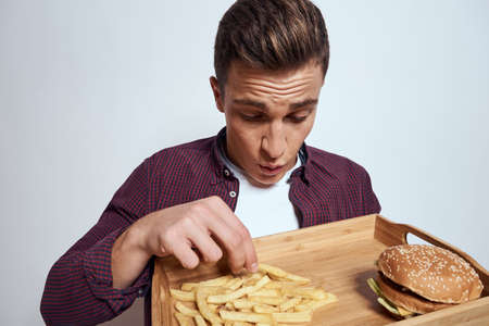 Man eating wooden pallet fast food french fries hamburger diet food restaurant light background