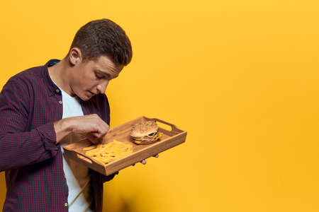 Emotional man fast food french fries hamburger lifestyle yellow isolated background