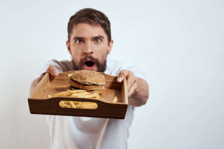 man with wooden tray fries and hamburger fast food calories model white t-shirt