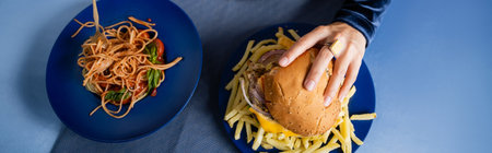 top view of cropped woman taking burger near french fries and spaghetti on blue plates, banner