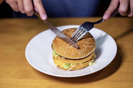 Woman eating vegan burger top view on a colored table. Woman hands holding knife and fork, preparing for eating a vegan sandwich.