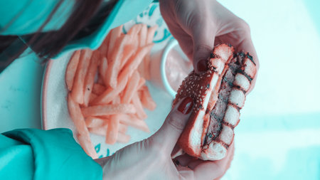 Young woman tempted by junk fast food and takes fries from plate. Selective focus, close up