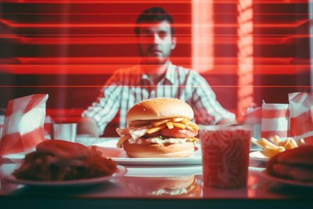 Man fat burger food hamburger hungry male adult junk unhealthy meal fast eat tasty