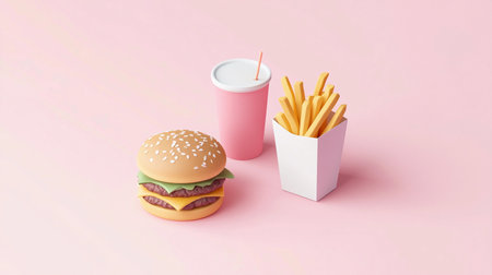 Whimsical burst of fast food items in a colorful scene, with burger, fries, and drink taking center stage.