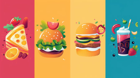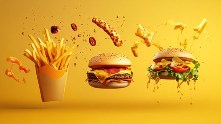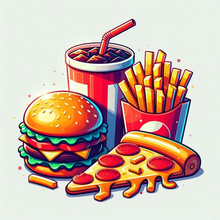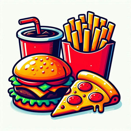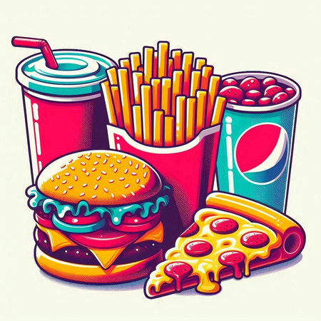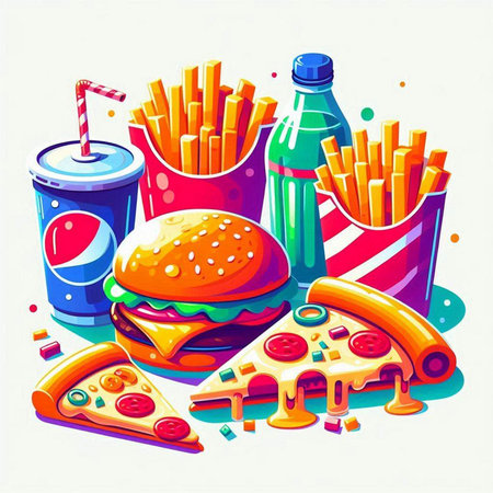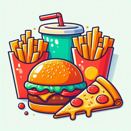 Stylized representations of burgers, fries, and pizza are arranged attractively on a vivid background, showing their appetizing appeal.