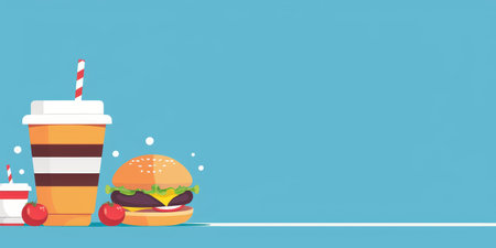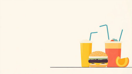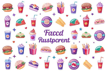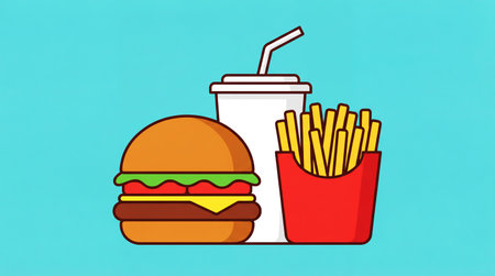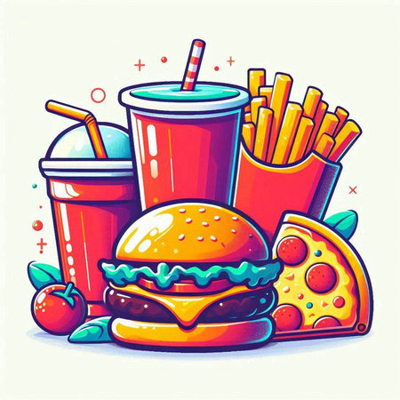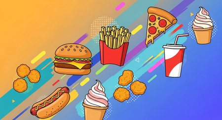 Colorful, stylized representations of fast food icons include burgers, fries, and drinks, set against a bright, engaging backdrop.