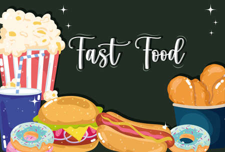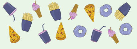 Fast food vector illustration. Hamburger, french fries, soda drink and pizza.