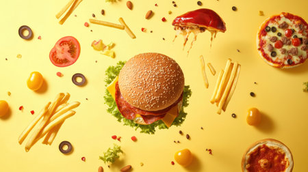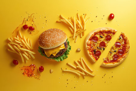 Stylized representations of a burger, pizza, and fries are arranged artistically on a bright yellow surface, capturing the essence of fast food.