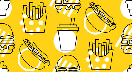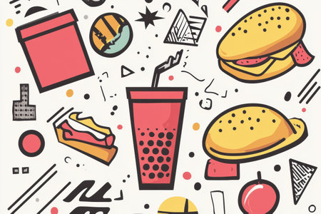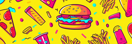 Stylized representations of burgers, fries, and snacks are combined in bright colors, creating an engaging and appetizing visual appeal.