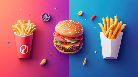 Stylized fast food representations of burgers, fries, and pizza are creatively displayed on a bright and vibrant backdrop.
