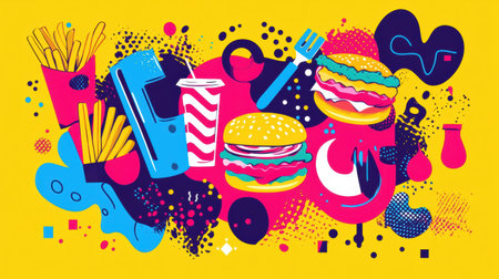 Colorful abstract visuals of iconic fast food items like burgers, fries, and pizza create a lively and appetizing display on a yellow background.