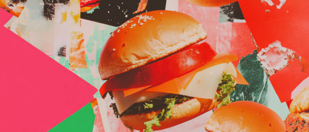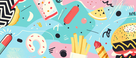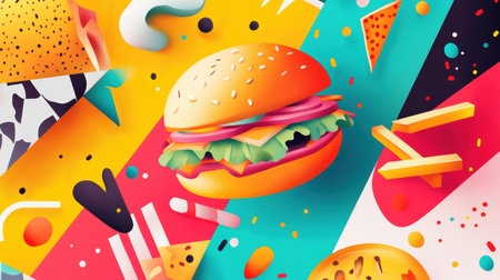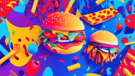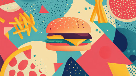 Bright abstract representations of burgers, fries, and pizza come together on a vivid backdrop, celebrating fast food culture creatively.