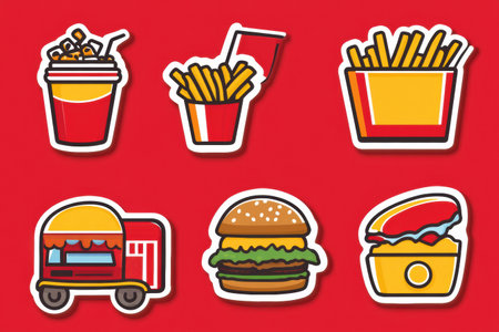 Colorful cartoon stickers feature a food truck, tasty burger, crispy fries, and soda on a bright red background, perfect for street food fans!