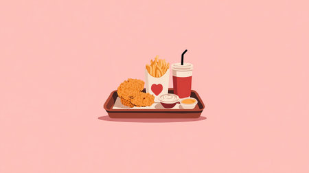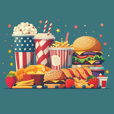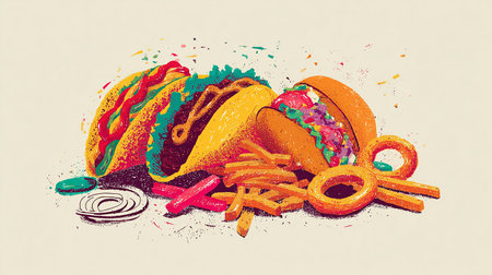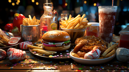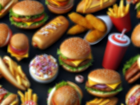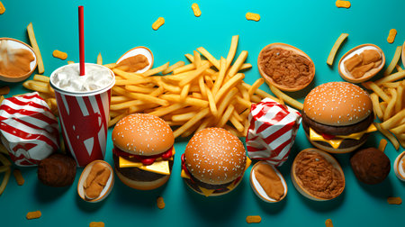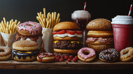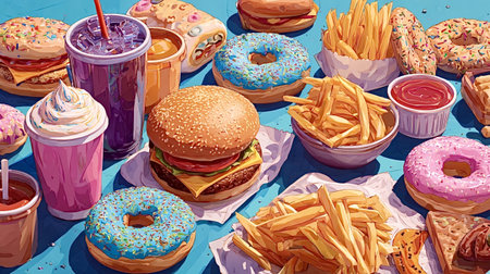 Vibrant top down illustration showcasing various fast food items including burgers, French fries, donuts, wrapped snacks, and sugary drinks, creating a tempting display of indulgent treats