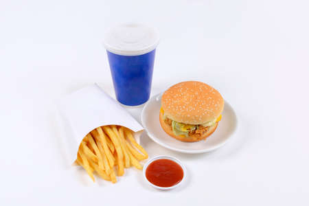 Hamburger, french fries and cola in paper cups on white background
