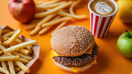 Close-up view of a cheeseburger, french fries, and a paper cup of coffee latte, all arranged on a vibrant orange surface. Fresh apples and crisp fries are included in the image.