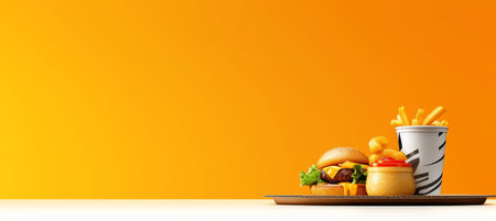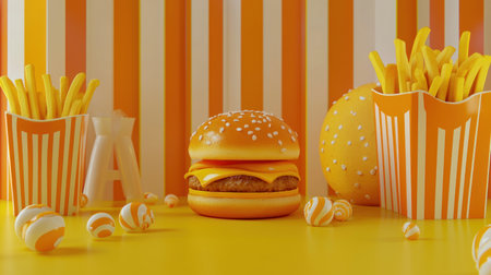 Digitally rendered still life featuring a burger, french fries, and other sweet treats on a yellow surface with orange and yellow stripes. The image showcases the fun and exciting nature of fast food in an attractive and bright manner.