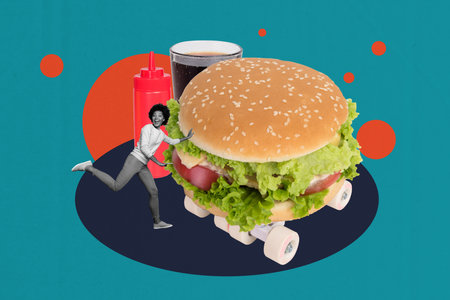 Trend template sketch design 3D photo collage of dieting huge hamburger ride skateboard restaurant glass soda drink hungry young lady run