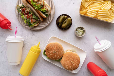Top view of fast food, hotdogs, chips, burgers and drinks. Top view. Flat lay.
