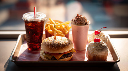 A vibrant fast food meal showcasing a juicy burger, crispy fries, refreshing soda, creamy milkshake, and delightful desserts, perfect for food lovers.