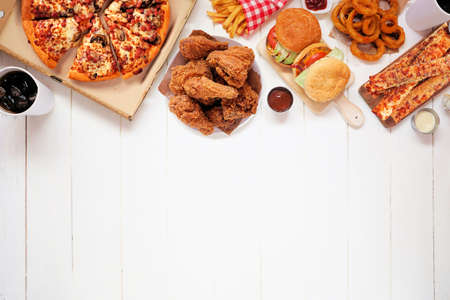 Variety of take out and fast foods. Pizza, fried chicken, hamburgers and sides. Top border. Overhead view on a white wood background with copy space.