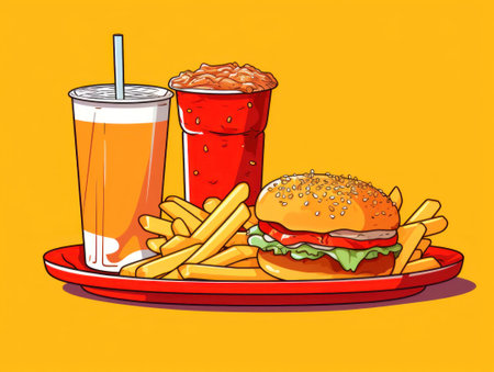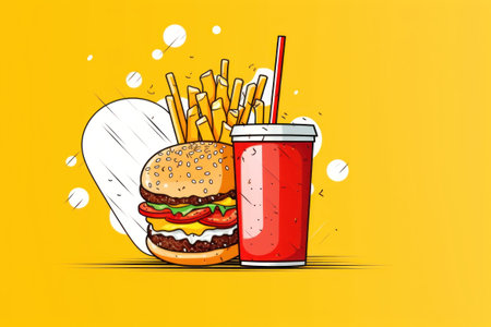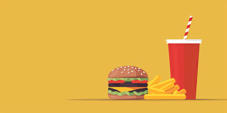 Fast food illustration of hamburger, french fries, soda and cola