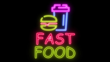 Neon glowing sign with burger and plastic glass of soda or coffee on black background. Computer graphics of electric luminous billboard, banner from blue yellow neon tubes. Neon signboard of fast food