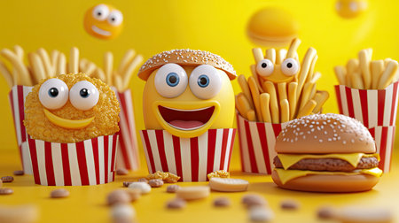 3D cartoon fast food with exaggerated eyes and smiles, fun vector style for kids and marketing.