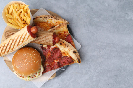 Different delicious fast food on gray table, top view. Space for text