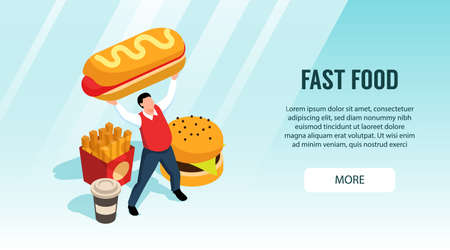 Isometric street food horizontal banner with more button editable text and images of fast food products vector illustration
