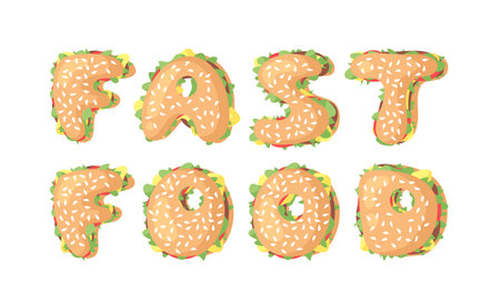 Hand Drawn Cartoon Burger Alphabet. Fast Food Vector Font. Tasty Illustration Meal and Text. Flat style collection