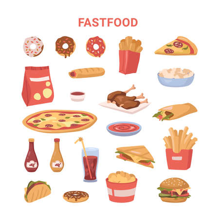 Fastfood dishes and meal products variety. Vector in flat style, donuts with chocolate glazing, french fries and pizza slice. Hot dog and burrito, soda sweet beverage and burger with chicken