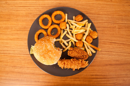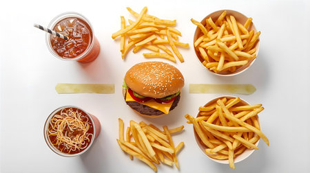 A hamburger and fries are arranged in a circular pattern, AI