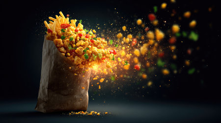 This dynamic image showcases a paper bag bursting with colorful food items, highlighting a mix of fries and popcorn in an eye-catching explosion.