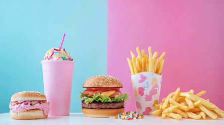 A vibrant layout showcasing a colorful milkshake alongside a classic hamburger and golden fries, set against a playful pink and blue background. Perfect for food lovers!