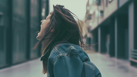 A lively young woman with dark hair joyfully runs her fingers through her hair, radiating pure happiness. The blurred motion captures her vibrant energy, inviting viewers to share in her carefree spirit and infectious joy.