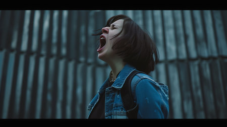 A man expresses strong emotions while shouting droplets of water glistening on his face under vibrant lighting creating a powerful visual impact.