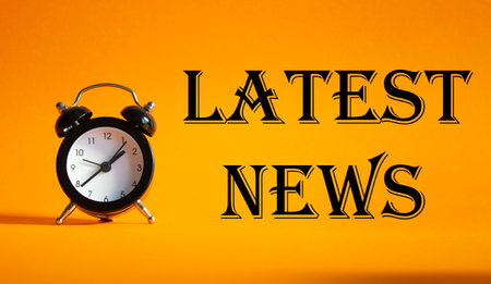 Latest News symbol. Concept word Latest News on Beautiful orange background with alarm clock. Business and Latest News concept. Copy space