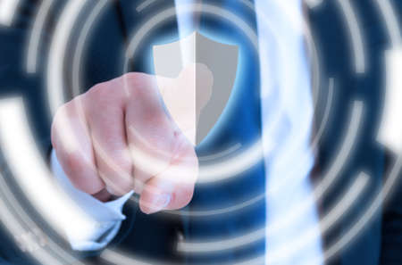 Data or network protection, businessman press shield icon, web button, virus cyber security. Insurance Digital crime by hacker concepts. Information security against viruses, System binary Matrix.
