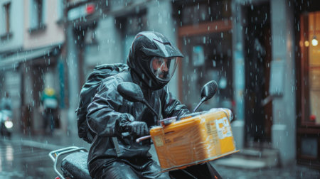 food delivery person, rushing through storm with box of hot food, created with generative ai