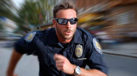 An officer in a navy uniform sprints down a bustling street, displaying focus and intensity. Bystanders observe as he participates in a training exercise designed to enhance response time and agility.