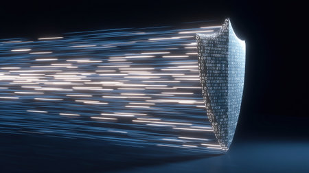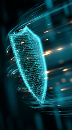 a digital shield made of binary code represents cybersecurity and data protection, ensuring network safety, privacy, and technological security