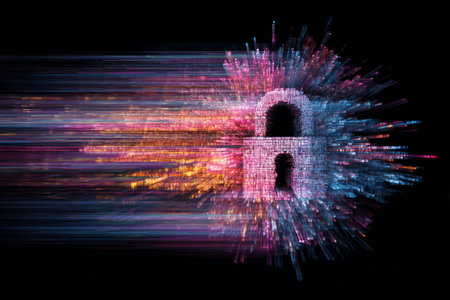 An abstract padlock is illuminated by dynamic neon lines depicting movement and energy, emphasizing the concept of security in a modern context.