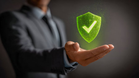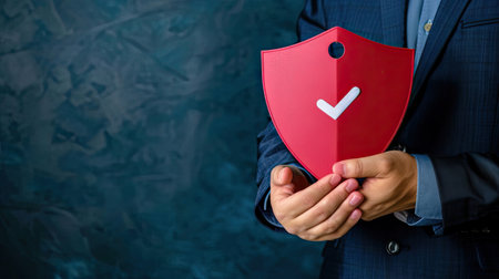 A man in a sharp suit confidently holds a red shield with a check mark, symbolizing protection and validation of his achievements.