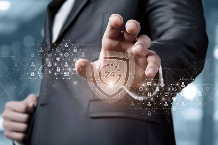 The concept of protection 24 hours a day. Businessman hand shows shield.