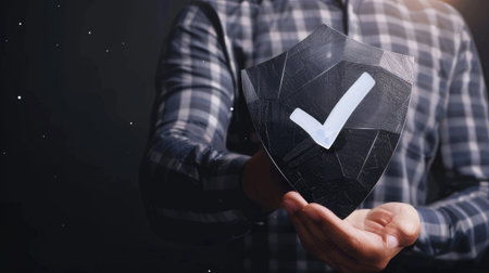 A virtual shield lock icon with the correct sign appeared on the human's hand on dark background with copy space. Cyber security, data protection, business privacy technology concept.