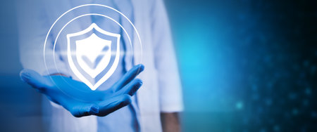 Medical health and life insurance concept , Hand holding Protective virtual guard to prevent corona virus or COVID 19. Healthcare concept by 3d render.