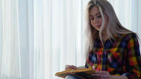 Reading and development. Beauty young woman is reading a book at home. Thoughtful girl reading important book.